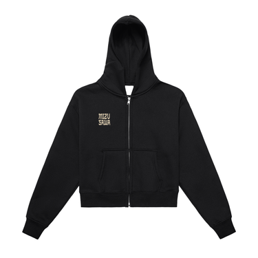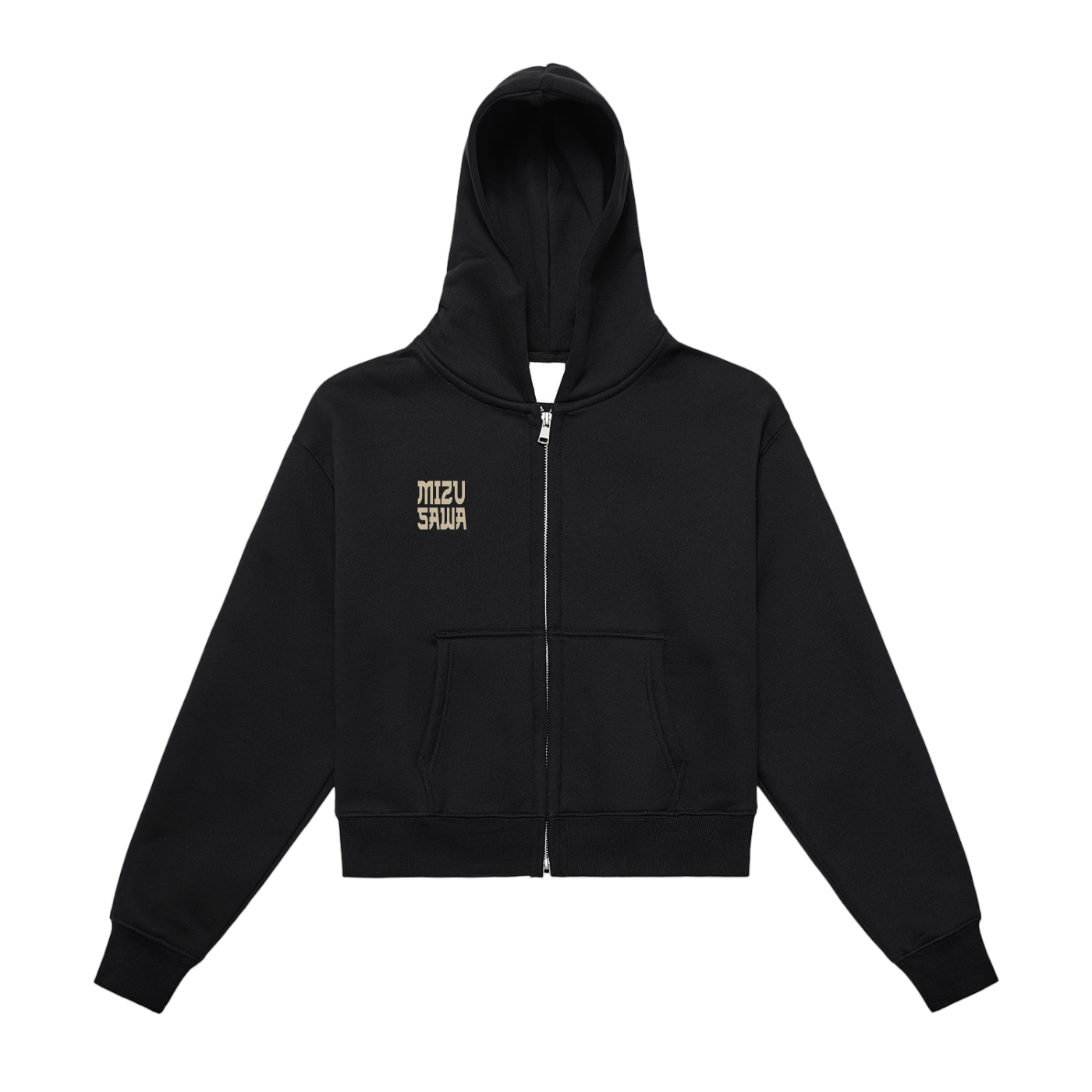 Materials: A thick, cozy cotton-blend fleece with a smooth finish, drop shoulders, a full zip, and a cropped hooded silhouette.